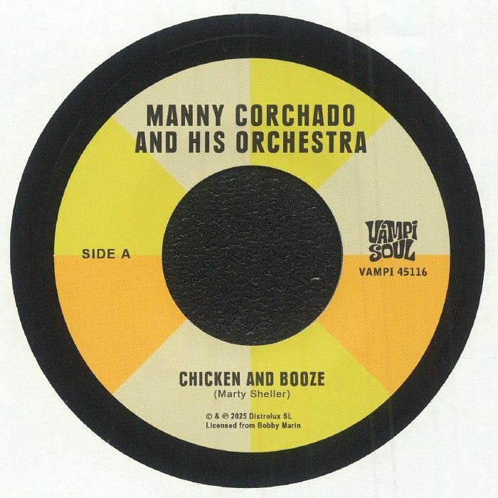 Harlem percussionist and Salsa bandleader Manny Corchado's boogaloo grooves remain essential listening decades after first impact. On the 7" 'Chicken And Booze / Aguardiente Y Pollo', we've a practical genre-define, recalling the energy of his classic 'Pow-Wow', but with a B-sider's burn, where this track originally appeared on that one's rear end. Nelson y Sus Estrellas, the Venezuela-based tropical orchestra led by pianist and composer Nelson Gonzalez Rojas, delivers the Spanish language take on the same tune; their take keeps the dancefloor drive intact while weaving in richer melodic lines and salsa-infused arrangements.