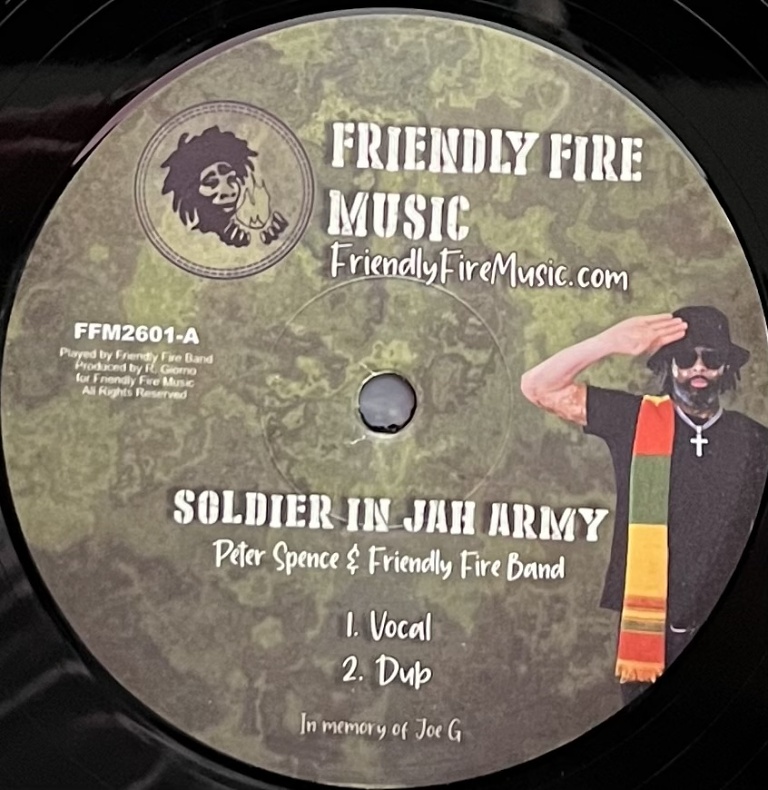 Heavy pressing 12" 45 RPM Vinyl record featuring Soldier in Jah Army (vocal cut) by Peter Spence, Mr. Devil Boy (DJ Cut) by Myki Tuff and a dub and an instrumental version of Friendly Fire Band's relick of Barry Biggs's Work all Day.